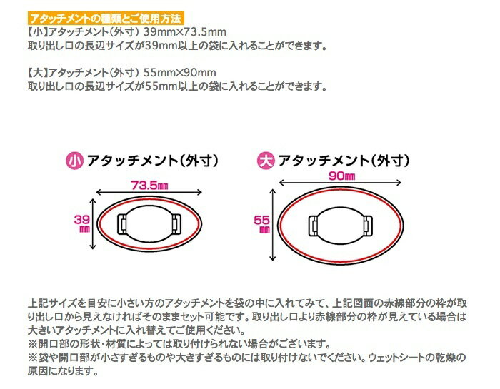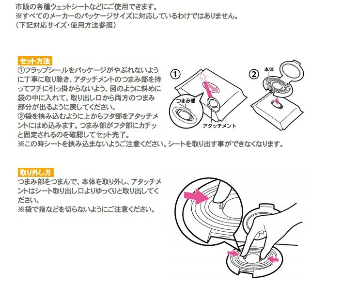 セット方法 フラップシールをパッケージがやぶれないように丁寧に取り除き、アタッチメントのつまみ部を持ってフチに引っ掛からないよう、斜めに袋の中に入れて、取り出し口から両方のつまみ部分が出るように戻してください。